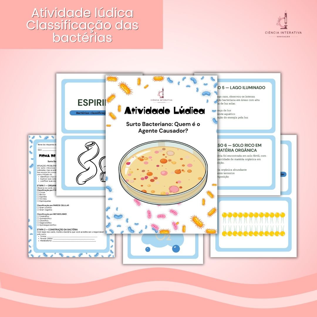 O recurso “Surto Bacteriano” foi desenvolvido para trabalhar o estudo das bactérias de forma dinâmica, desafiadora e com forte base científica, colocando os alunos no papel de investigadores microbiológicos diante de situações reais.